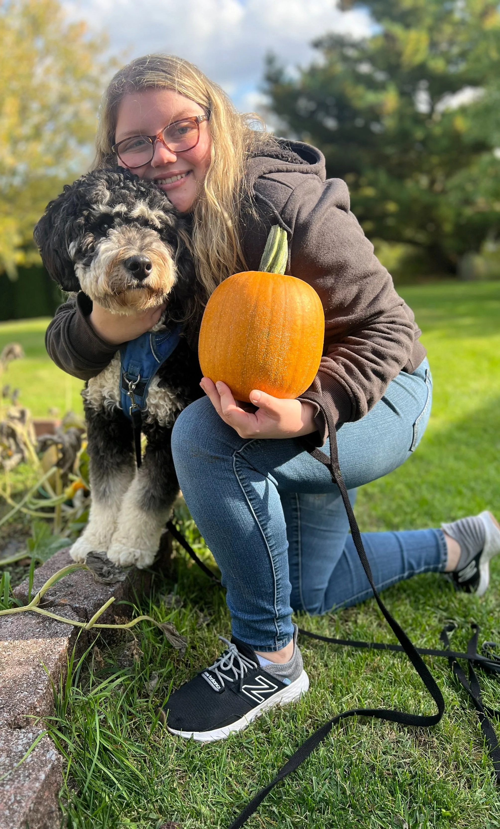 My puppy, Georgie, loved going to see the pumpkins in the backyard!